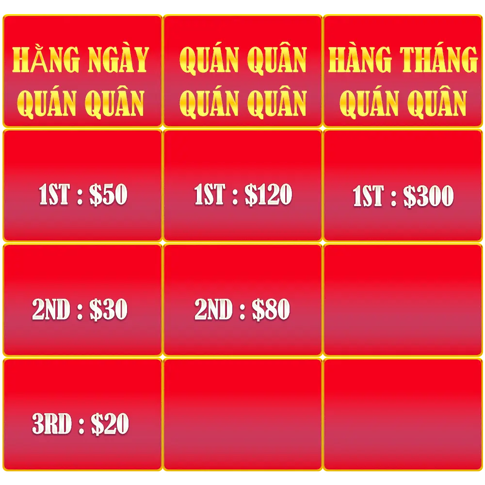 Nhà vô địch hàng ngày: Được trao cho 3 người chơi có điểm chiến thắng cao nhất trên bảng xếp hạng hàng ngày.