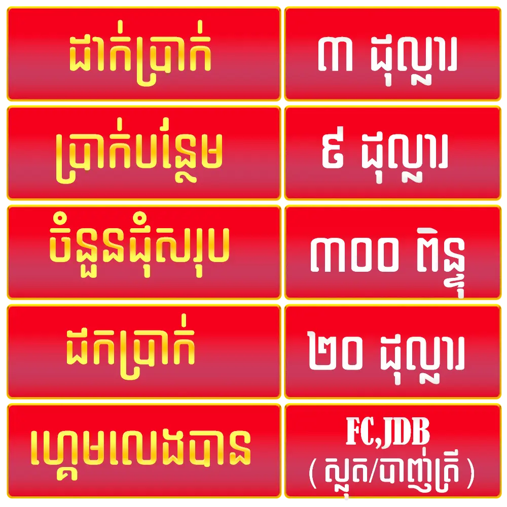 2.ការផ្តល់ជូននេះលេងបានចំពោះហ្គេម៖ FC,JDB (ស្លុត/បាញ់ត្រី) និងតម្រូវឲ្យលេងចំនួនជុំសរុប ៣០០ ពិន្ទុ ទើបអាចចុចបញ្ចប់ប្រូម៉ូសិនបាន ។